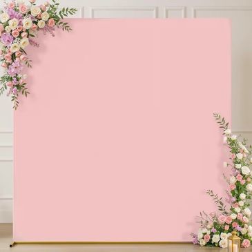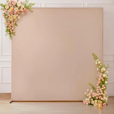 8x8 ft with Stand included. (Flowers or props not included) We can add high quality artificial flowers or a neon sign for an additional $99.